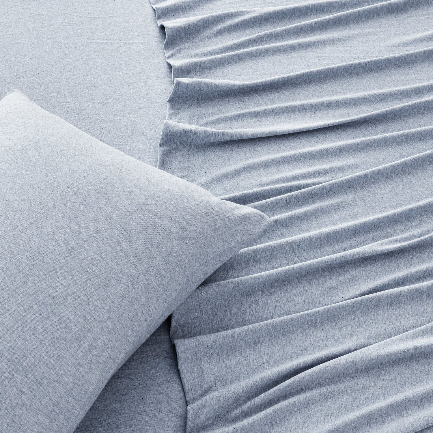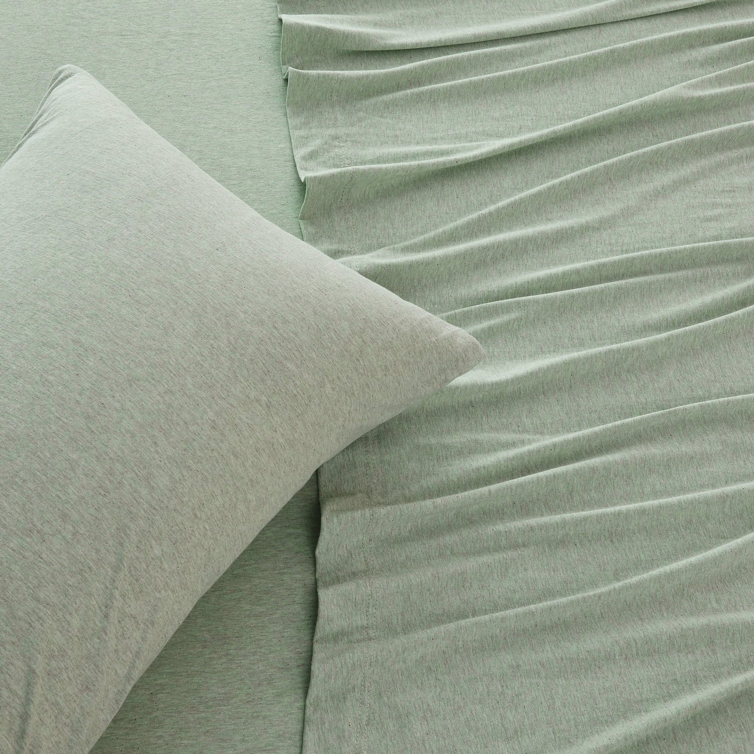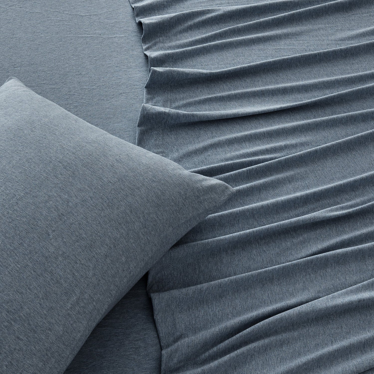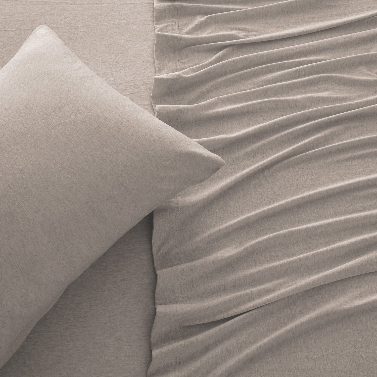 Wrap yourself in comfort with our heathered jersey knit sheets—just like your favorite worn-in T-shirt, but for your bed. Made from a soft and breathable cotton polyester blend, these sheets get even cozier with every wash. They naturally adapt to the seasons, keeping you cool when it’s warm and warm when it’s cool. The heathered melange finish adds a laid-back, effortlessly stylish touch to your space, while the slight stretch ensures a perfect, snug fit on your mattress. Easygoing, ultra-soft, and always inviting—these are the sheets you’ll never want to leave.