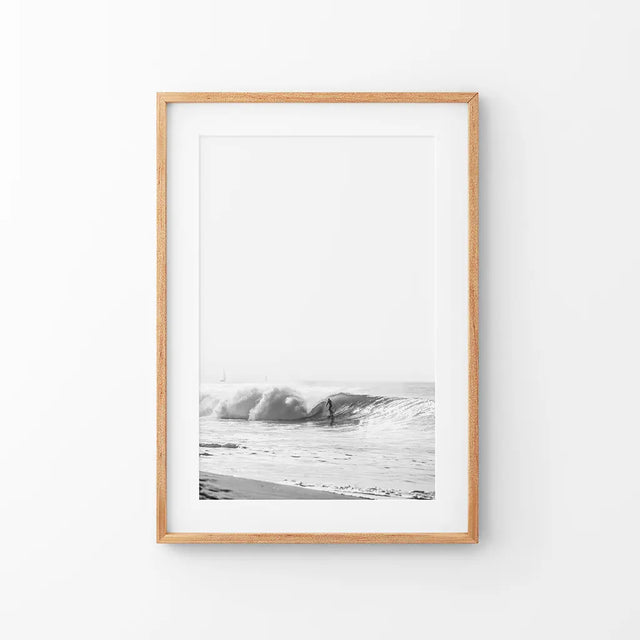 The poster depicts a surfer on the waves in a minimalist black and white style. This tropical wall decor will help you better feel the atmosphere of a California summer at the beach, and will also perfectly complement any space in your home.