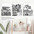 This set of black and white photos of Arches National Park has a minimalist style and looks very classy. Here we can see a retro bus, a desert tree, a cliff - all these elements together will perfectly complement your room. They look great in black frames with a mat.