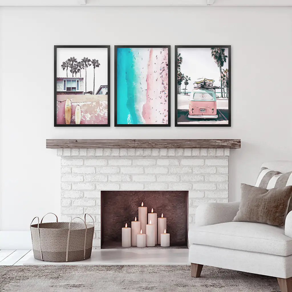 This boho-inspired wall art set will give you a good vibe that you can feel when you're on a California beach in the summer. The pictures draw us in with their bright, rich colors - pink and turquoise. This decor looks great in white frames with a matting.