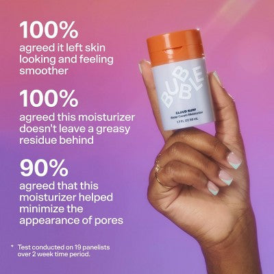 Bubble's Cloud Surf is a light-as-air water cream moisturizer that quenches & rebalances normal-to-combo skin without feeling sticky or heavy. Its floofy perfection minimizes the appearance of pores, helps balance oils, and leaves skin looking smooth, nourished, and oh-so-natural, even under makeup. Perfect for normal and combination skin.
