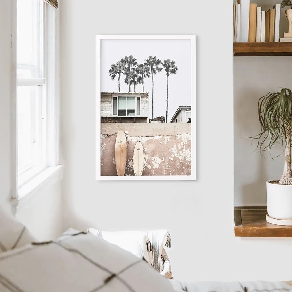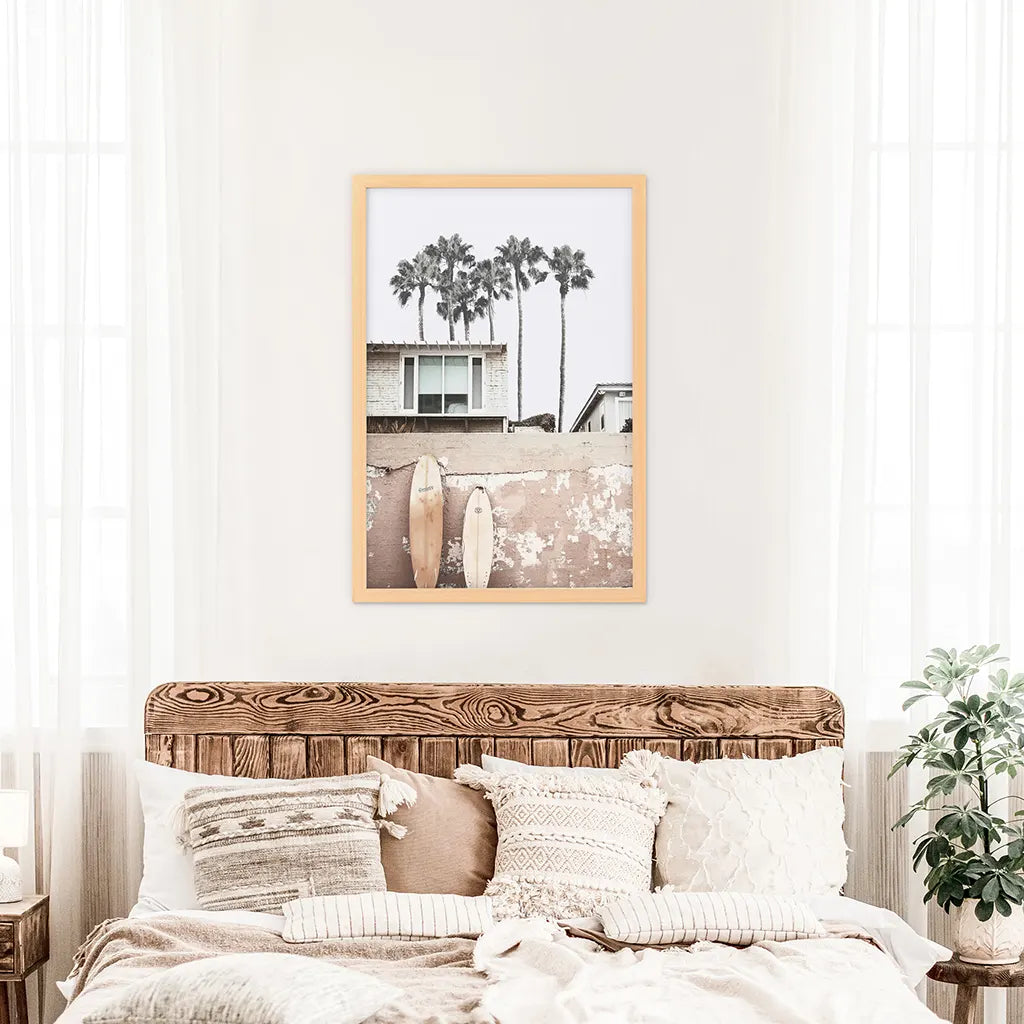 This boho-inspired print perfectly depicts the coastal lifestyle in California. It shows tall palm trees, a log cabin on the beach, and surfboards. All these details together create a unique atmosphere. Hang this poster in your bedroom or living room, it makes a great decoration.