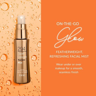 With your eyes closed, spray 4-6 inches away from face, neck and décolletage. Can be used as part of your morning/evening routine or anytime throughout the day to refresh skin. Can be applied as a finishing spray over makeup. For best results, use with other DHC Super Collagen Collection products.