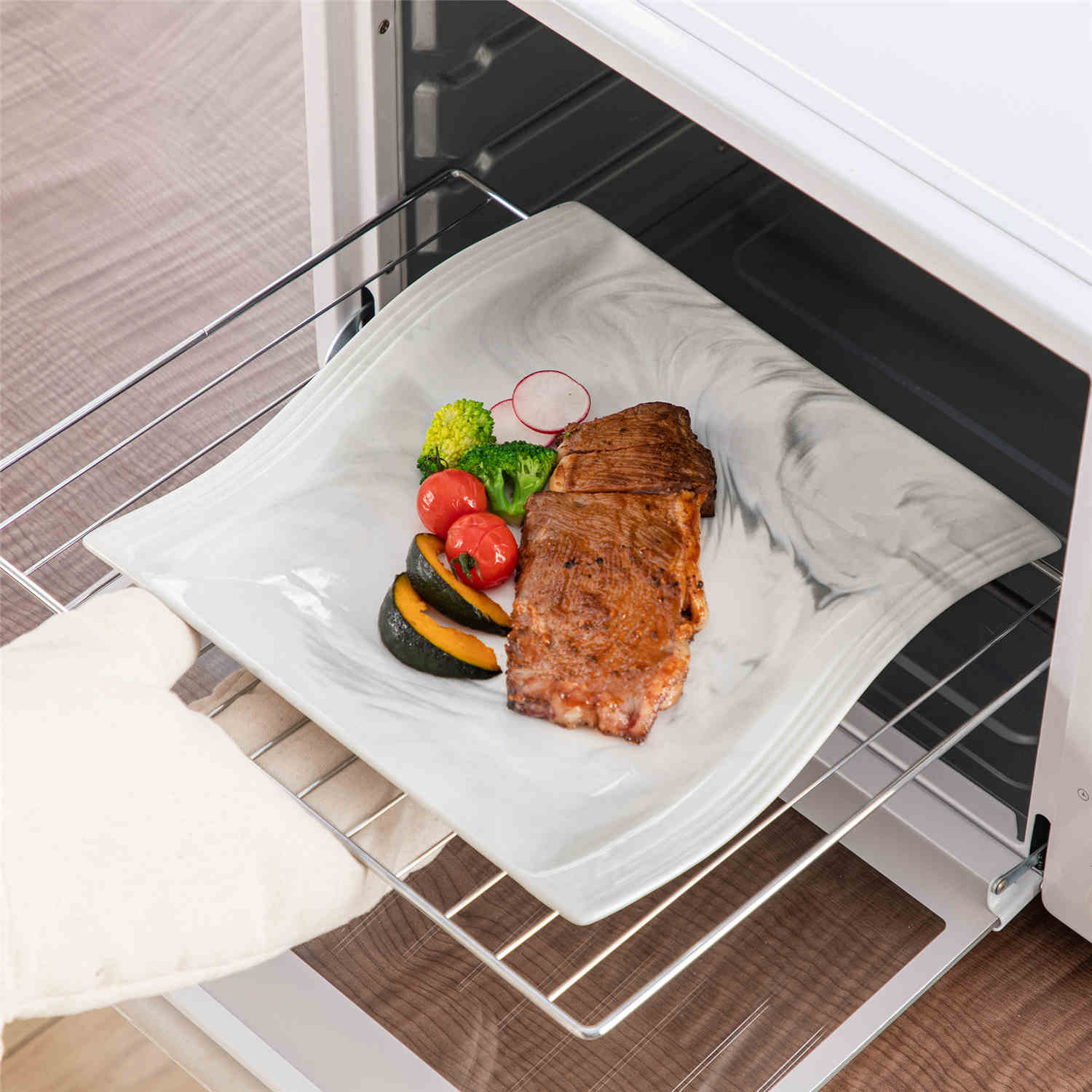 Inspired by fluid forms and modern geometry, the Flora 36-Piece Dinnerware Set adds a distinctive touch to your table. Each porcelain piece features wave-edged silhouettes and sleek geometric patterns, available in ivory white or marble grey. Serving six, the set includes dinner plates, salad plates, soup bowls, cereal bowls, and cups with saucers. Designed for both style and practicality, the dinnerware is microwave, oven, and dishwasher safe. Stackable and space-saving, Flora is perfect for everyday meals or special occasions, bringing effortless elegance to any setting.