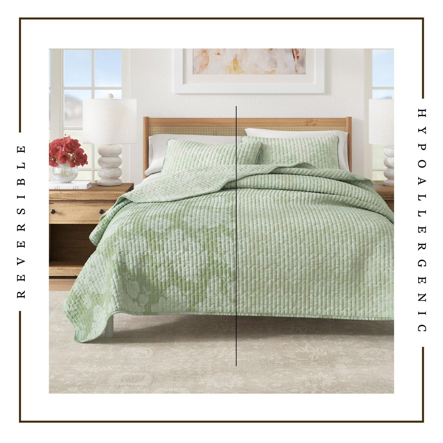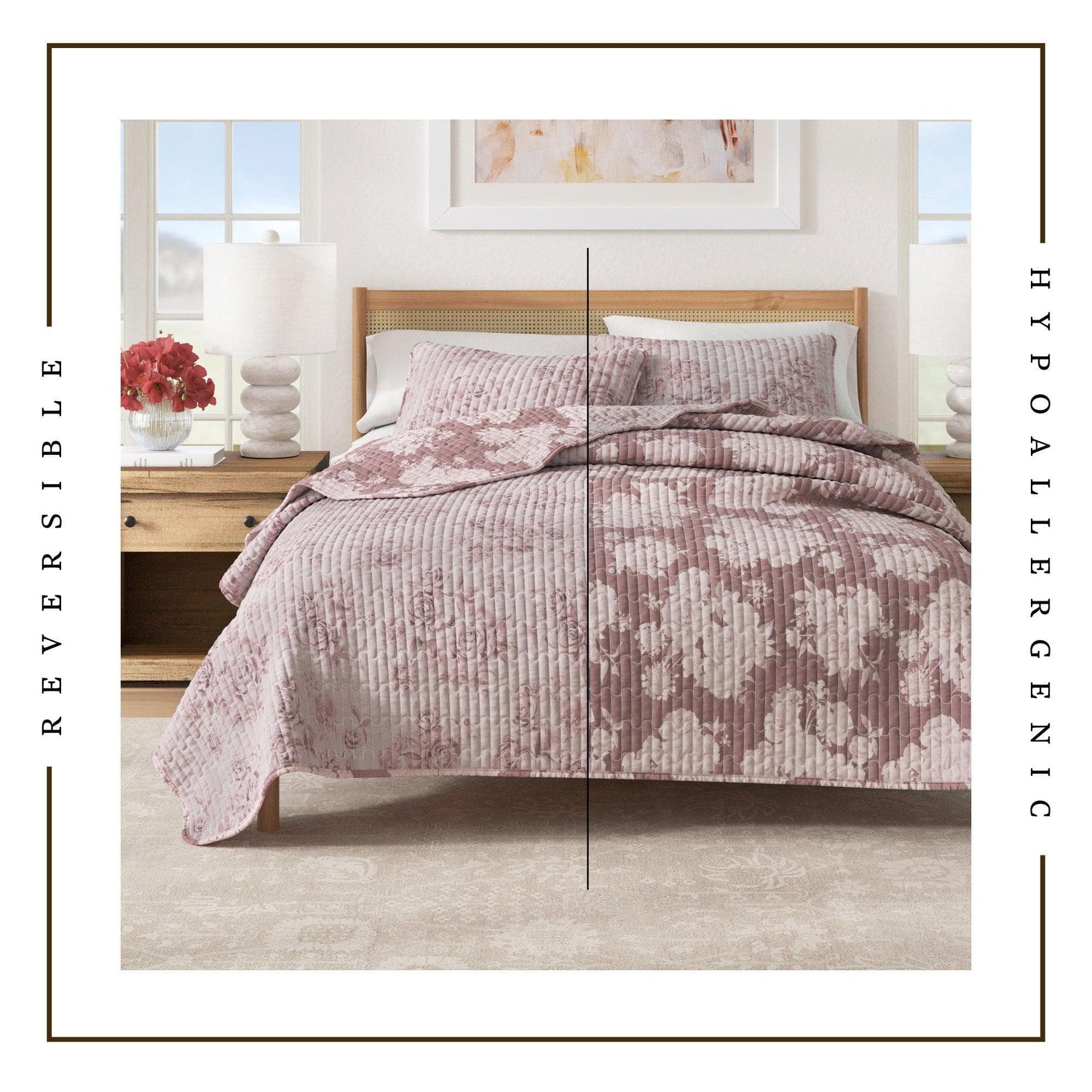 Bring a touch of nature’s elegance to your bedroom with our vintage-inspired floral cotton quilt set. This quilt and sham set showcases a charming, timeless floral print and infuses your space with understated sophistication and classic beauty. The reversible design features the inverse of the front, allowing you to refresh your decor effortlessly. Crafted from soft, breathable natural cotton with a down alternative fill, this lightweight quilt is perfect for layering and offers cozy comfort year-round. Celebrate the enduring appeal of floral design with a quilt set that seamlessly blends style, quality, and lasting charm.