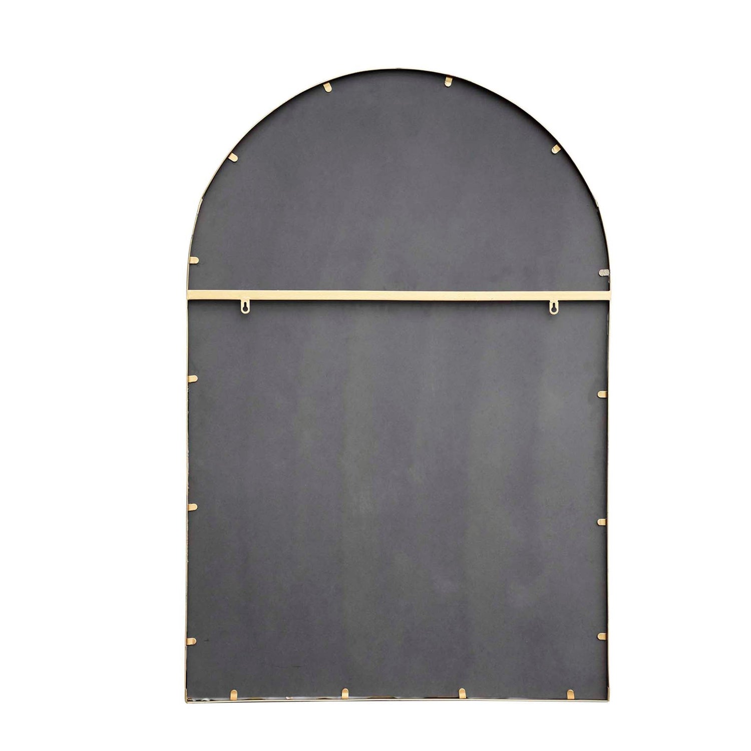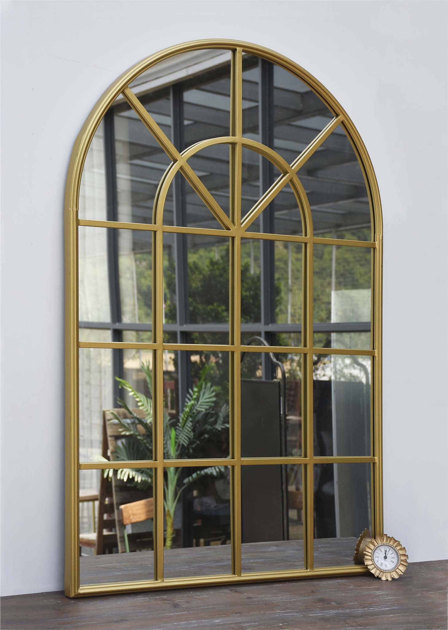 This metal framed wall mirror boasts a modern gold color, a rounded arch shape at the top, and features a cathedral window design.