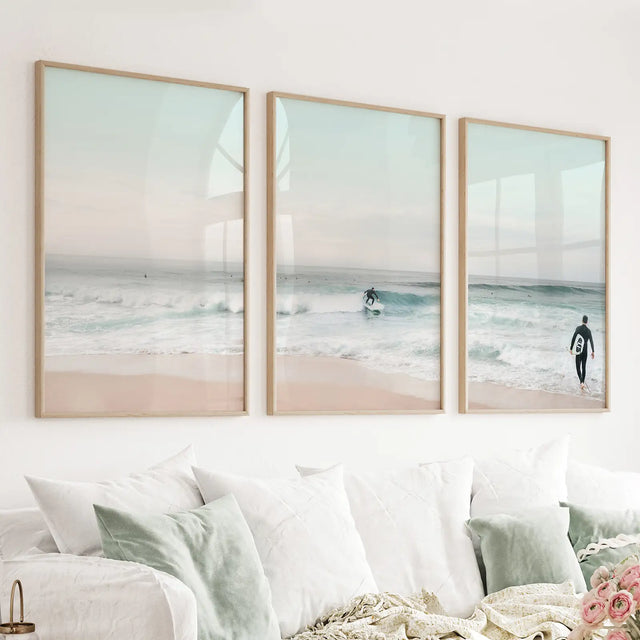 Ocean Beach Surf Prints. Turquoise and Pink Tones Wall Art