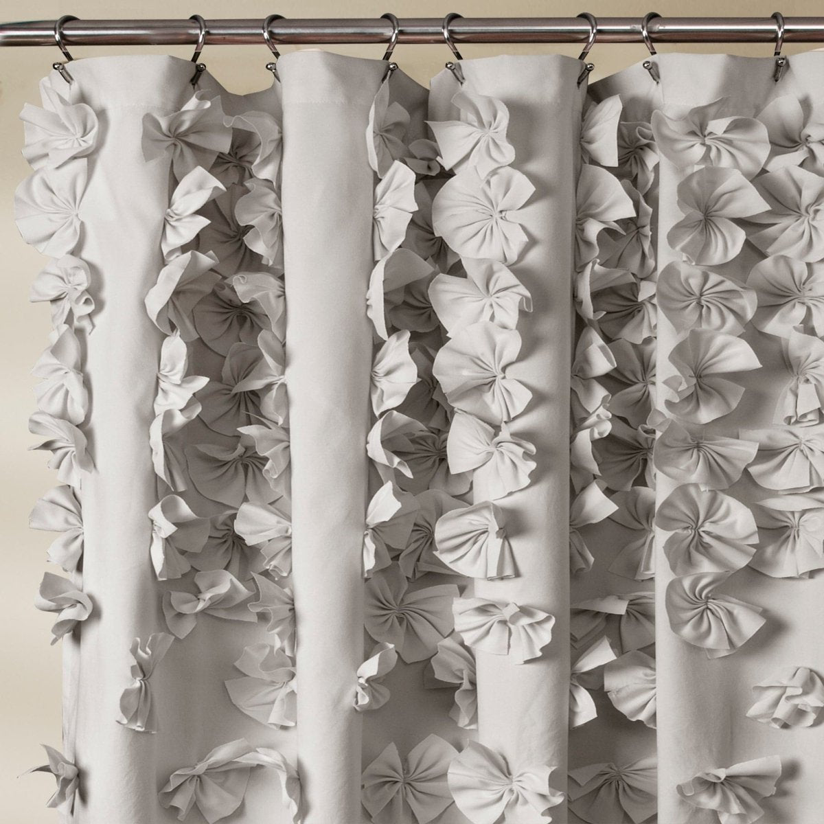 Cascades of handmade bow ties flow from top to bottom of the soft brushed poly fabric lending charm and luxury to the ambiance of your bathroom.