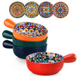 The Simi Soup Bowls Set of 4 adds a bold Boho chic touch with intricate patterns and a glossy, sleek glaze. These 23oz French onion soup bowls feature chunky handles for a secure grip, ideal for serving classic French onion soup with melted Gruyère, hearty chili, creamy chowder, or baked mac and cheese. Made from durable porcelain, they’re stackable for easy storage, microwave, oven, and dishwasher safe, and built for everyday use with a balance of style and function.
