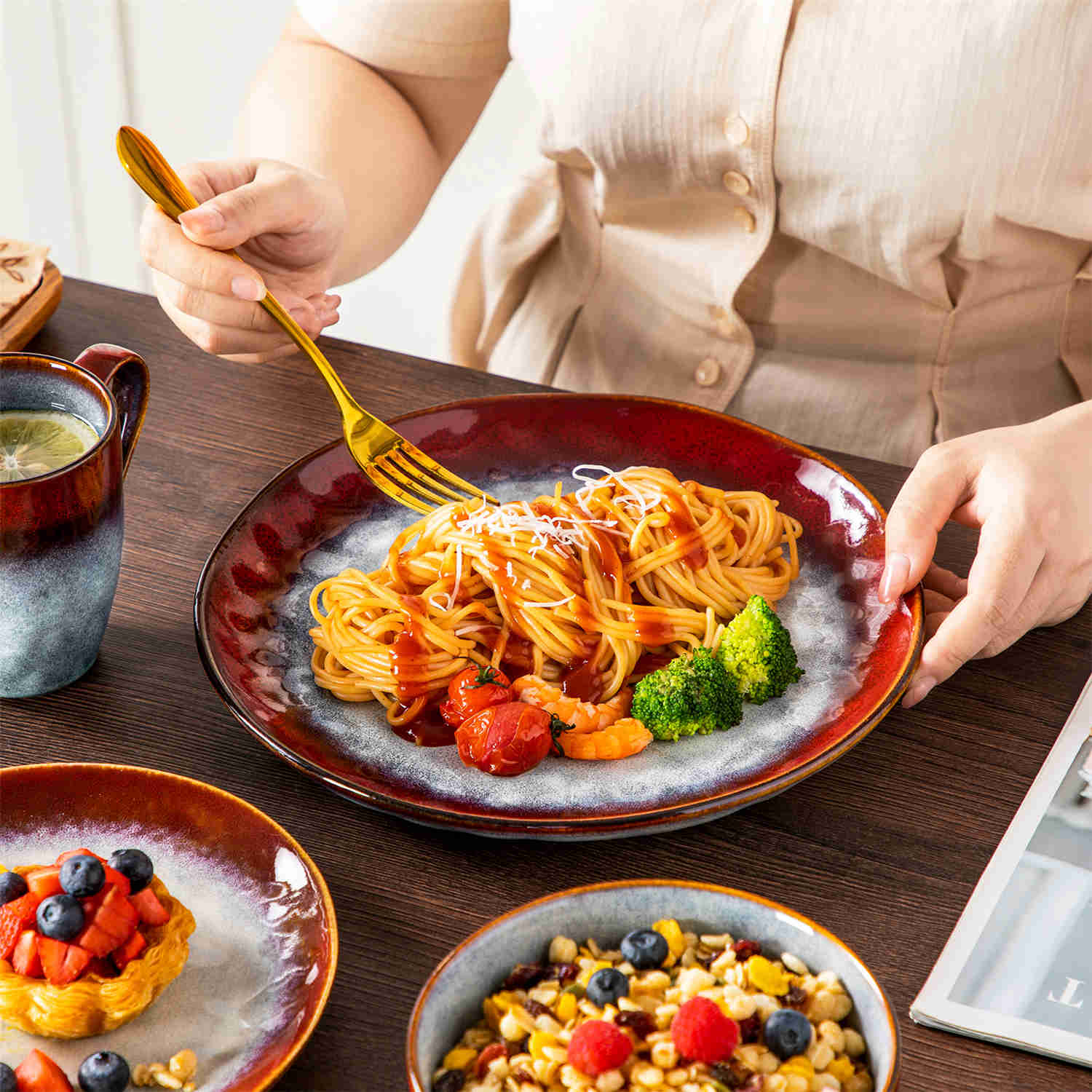 Inspired by the cosmos, this dinnerware set features a unique reactive glaze that gives each piece an organic, irregular shape and richly textured finish. Its glossy surface and unglazed, wear-resistant bottom combine aesthetic appeal with practical durability. Available in blue, green, red, and gradient green, the vibrant colors add a celestial flair to your table. Crafted from premium stoneware, this set is microwave, oven, and dishwasher safe, blending farmhouse charm with contemporary convenience. Serving four, it includes dinner plates, salad plates, bowls, and mugs. The green dinnerware now exhibits a delicate blue tint, creating an eye-catching teal hue.
