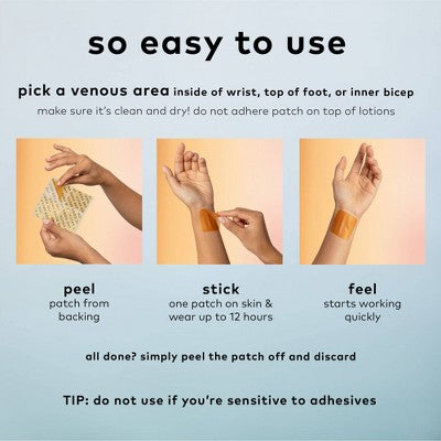 Peel and place one patch on inside of wrist, or any venous area that is clean and dry. Patch may be worn up to 12 hours. All done? Simply peel the patch off and discard.