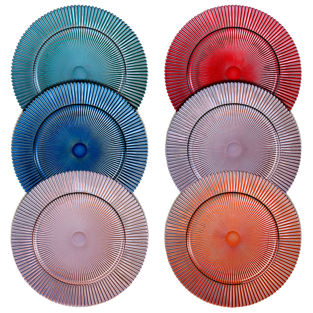 Muted Glass Ribbed Plates, Set of 6. 10.6" diameter.