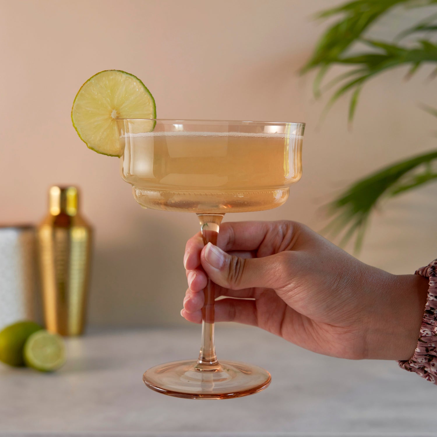 With a charming vintage silhouette and amber-tinted hue, these stemmed coupes bring visual interest to your home bar or dinner parties. They’re perfect for a mid-century modern style home or as a unique gift for cocktail lovers with a vintage aesthetic.