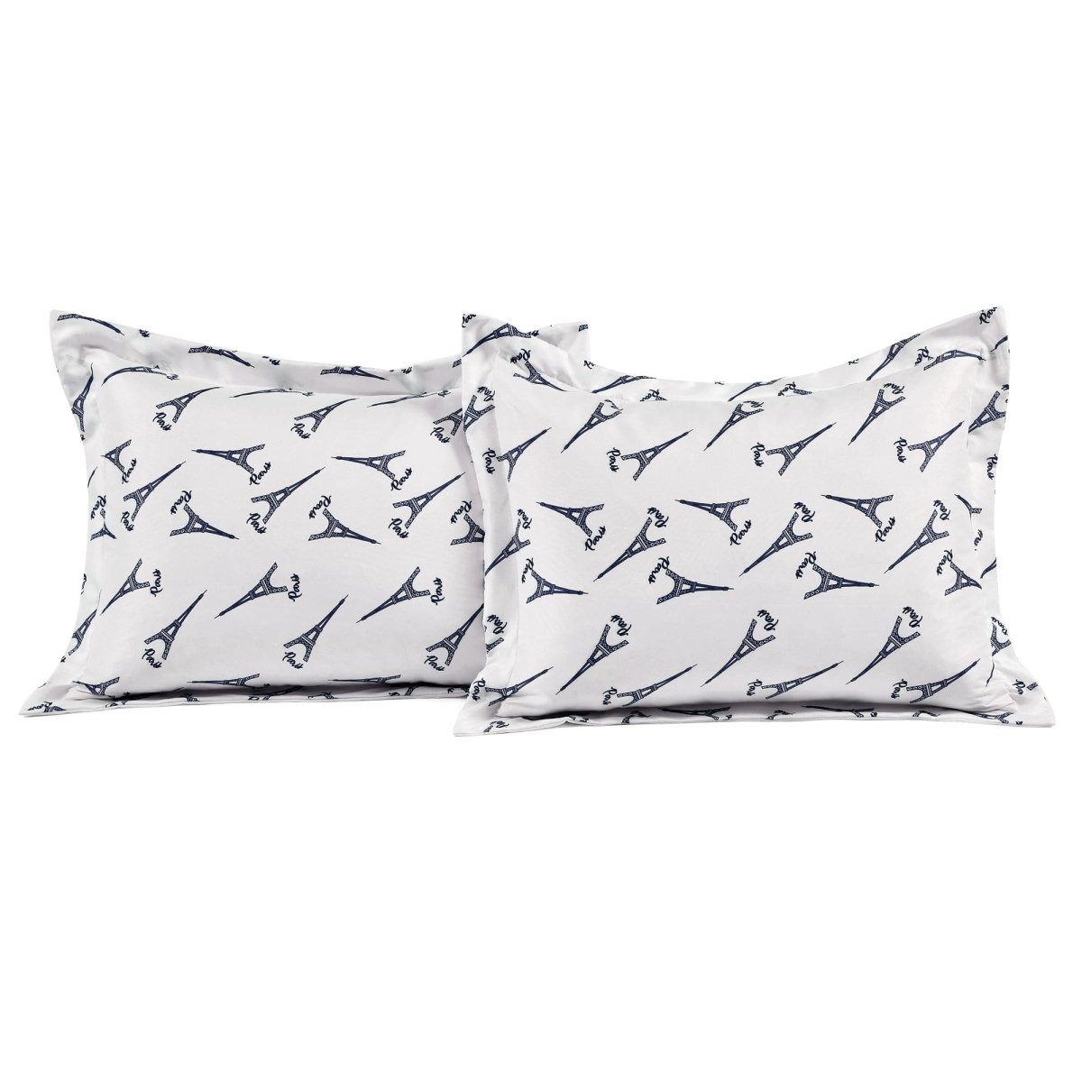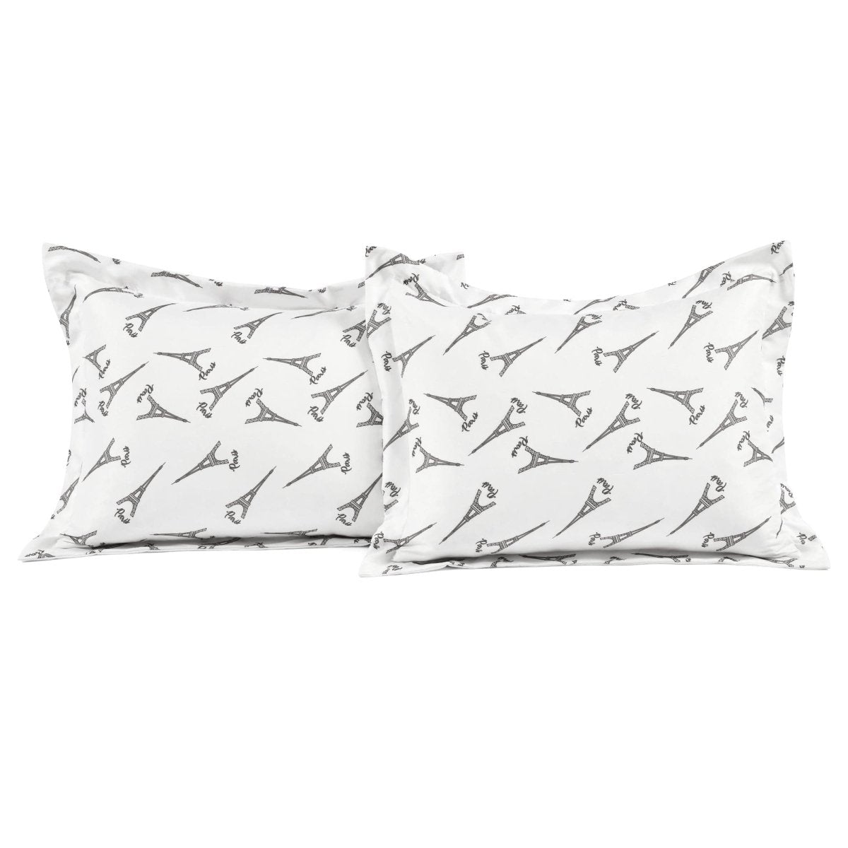 The reverse side of this Vintage Paris Rose Butterfly Script Comforter Set features the Eiffel Towers and the word Paris engineer printed against a white background. This gives you two great looks in one set. When you're ready for a change, simply turn the comforter and shams over to the other side and you have a whole new look. This side with its more subtle print is ideal for layering.