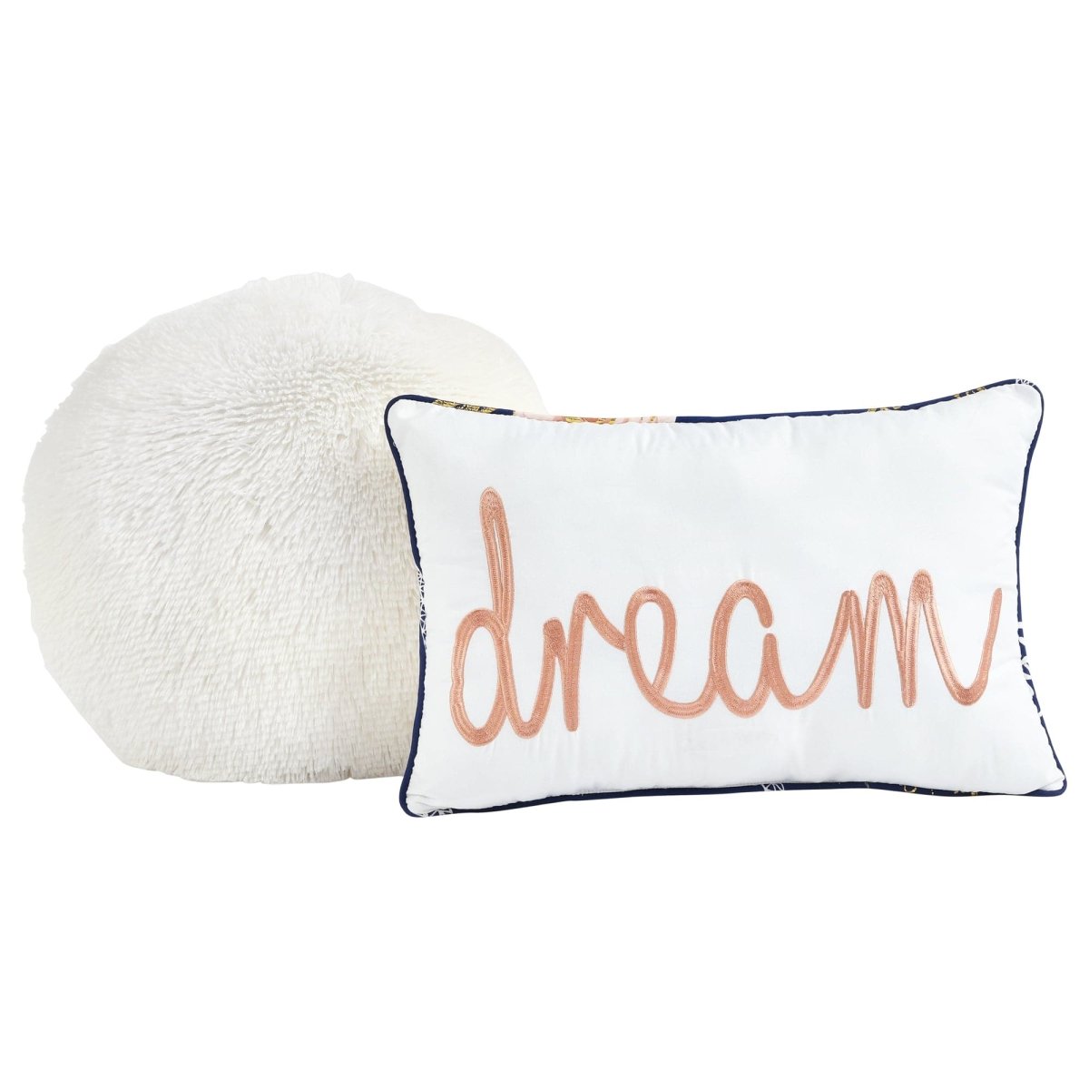 The rectangular decorative pillow features the word Dream embroidered on the front with unique trim detail. The circular decorative pillow is an off-white faux fur pillow for added texture and coziness.